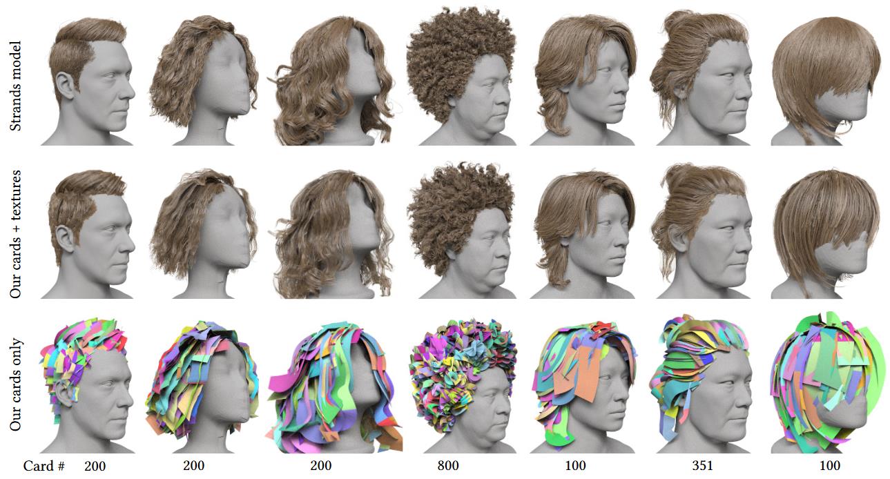 Our automatic pipeline can convert a wide variety of strand-based hairstyles with 40K strands into hair card models using a small number of cards (bottom, depending on hairstyles) and 32 individual card textures, while preserving high visual fidelity. Here, we show the input strand model, our generated cards only, and cards rendered with textures.